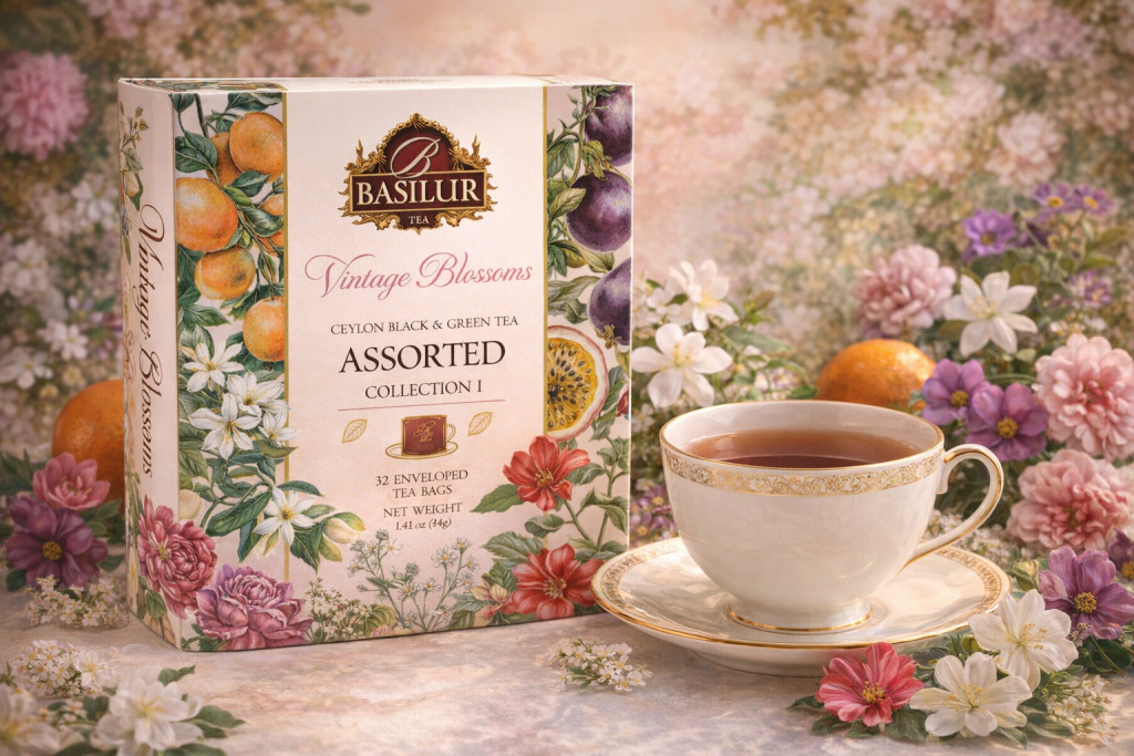 Basilur-Vintage Blossom-ízesített fekete és zöld tea ,fémdobozban.(32db filter)