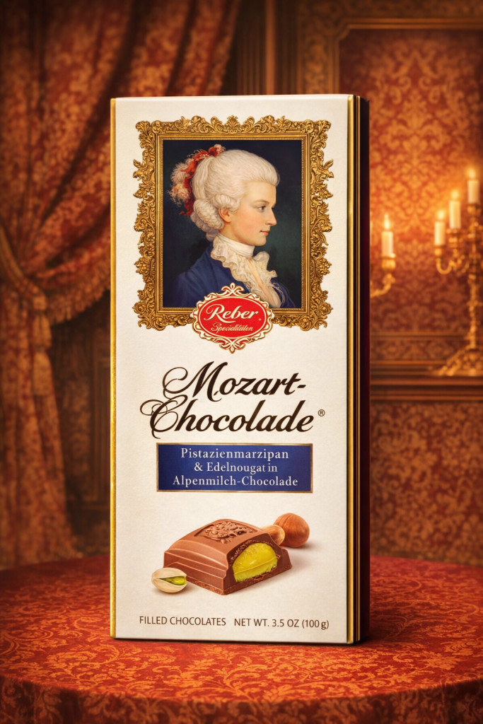 Reber-Alpesi tejcsokoládé (72%) mogyorós nugáttal (18%) és pisztácia marcipános töltelékkel (10%).